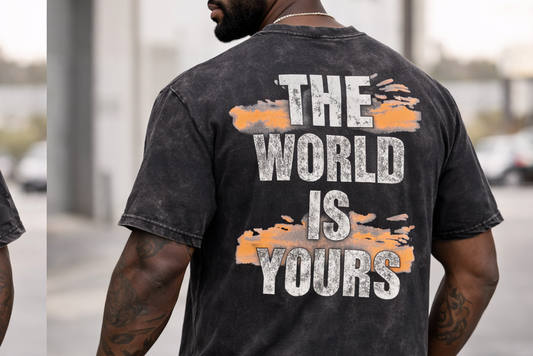 “The World Is Yours” Acid Wash Graphic Te black and orange