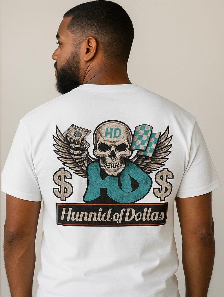 Stand out in the Hunnids of Dollaz Graphic T- Shirt featuring bold “Hunnids of Dollaz” lettering across the chest and a custom skull-head design with racing flags for that street-meets-speed energy. This turquoise tee brings style, confidence, and attitude to every fit. Perfect for everyday wear or matching with your favorite kicks.